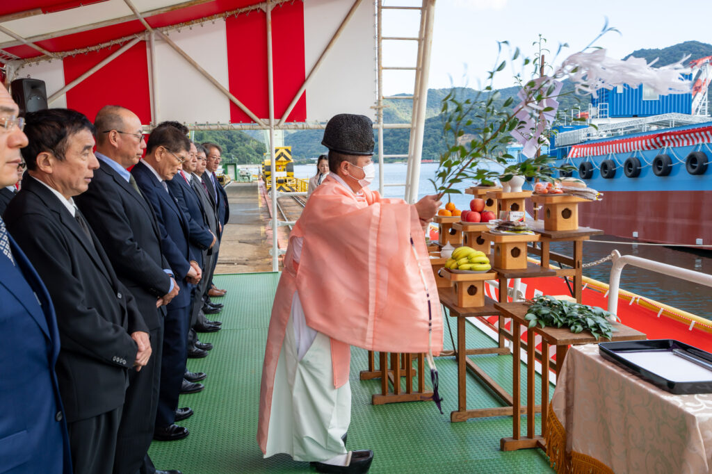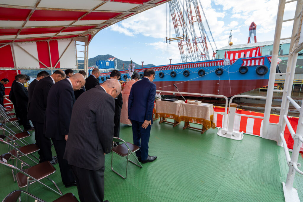 8月27日(水)、深田サルベージ建設株式会社殿から受注した起重機船の安全祈願祭を深令-6500の台船上で執り行いました。